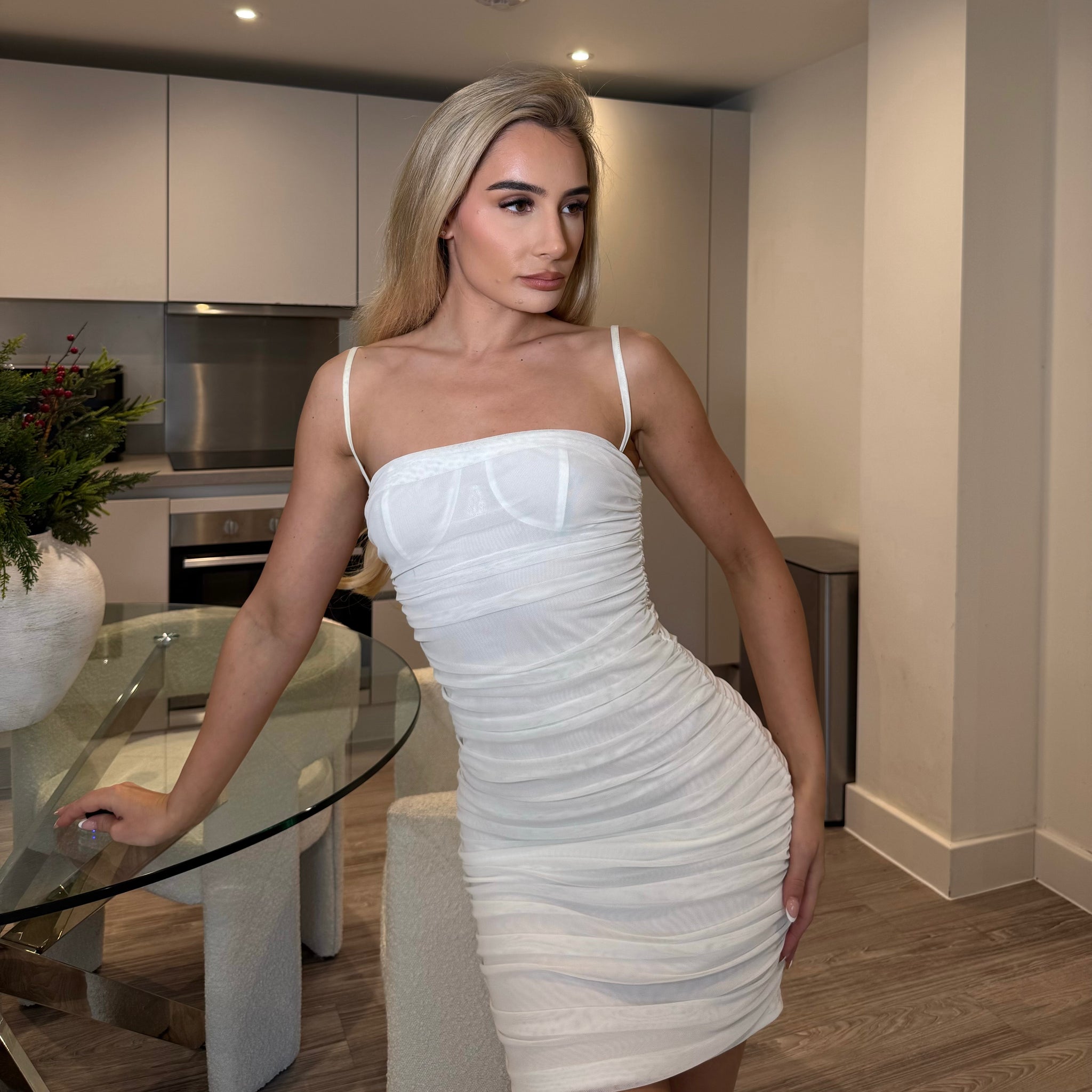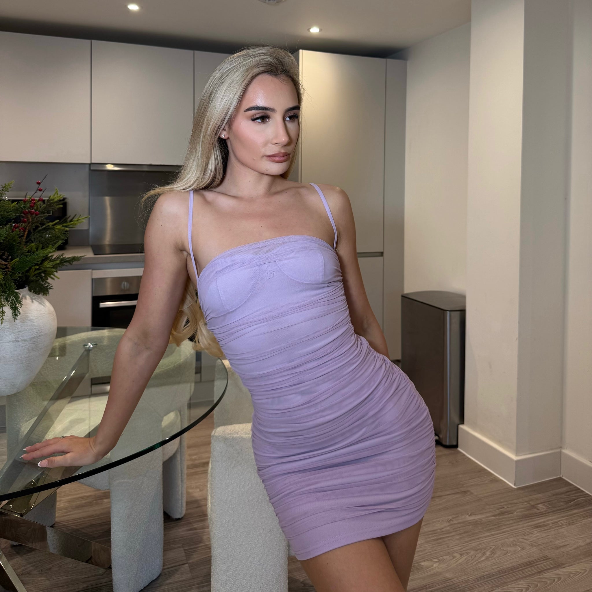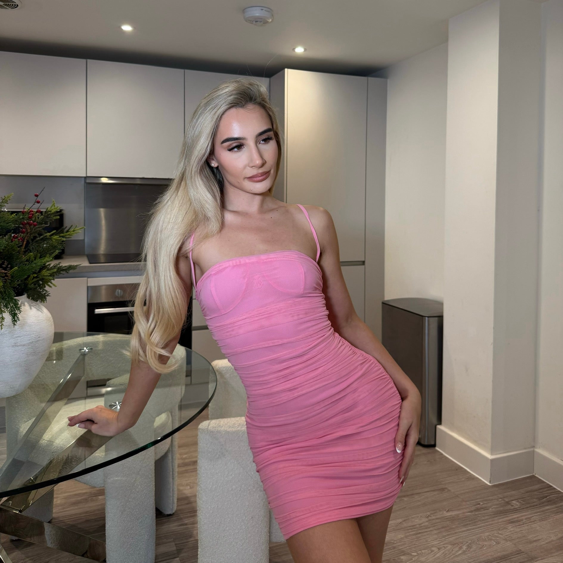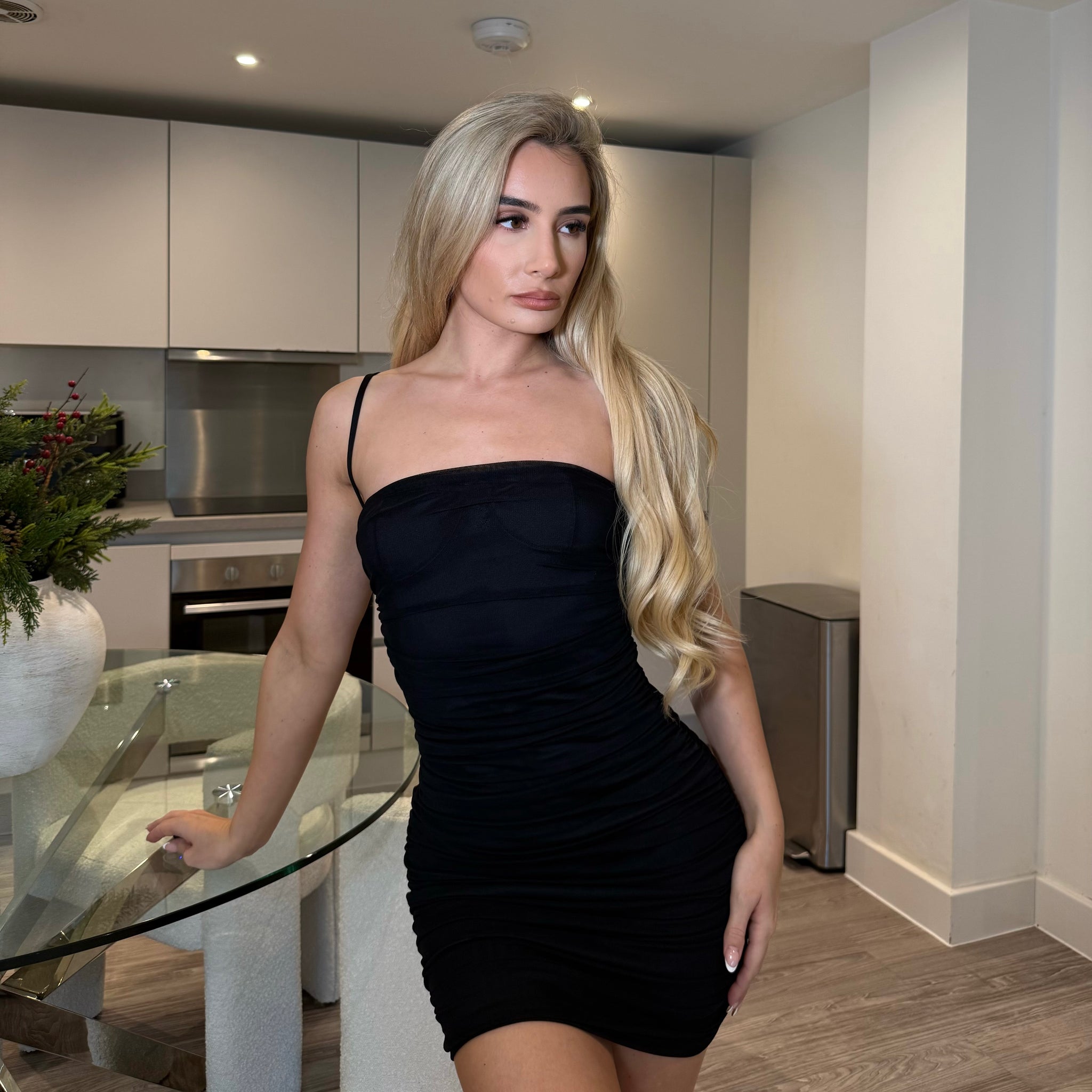 We delivered on this one boo! The material on this ruched dress is next to nothing! Not only is this dress double layered - the first layer is a thick nylon material that hugs your body like second skin. It will accentuate all your luscious curves, make your booty look so peachy with the detailed middle ruching. To top it all off, this beautiful dress has our signature logo so elegantly placed on the chest of your new dress.