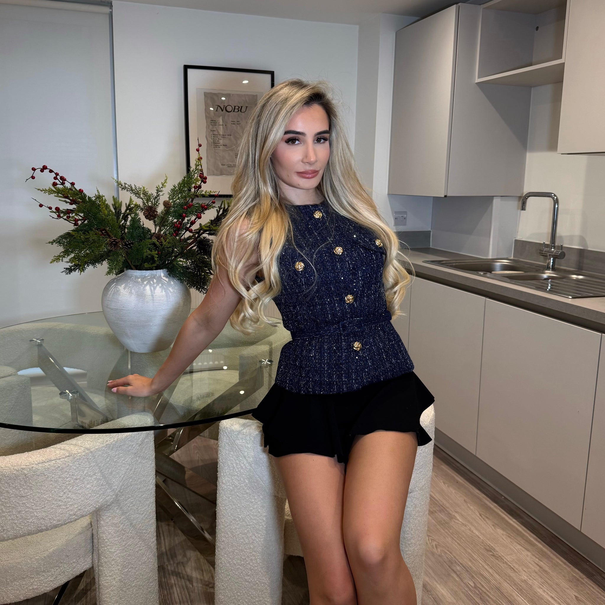 Our Tailored Navy suit is designed to sculpt and flatter the silhouette with its beautifully structured fit and cinched waist belt. Crafted in a rich navy textured fabric with subtle sparkle woven throughout, it catches the light in the most understated way — perfect for both day and evening styling. Finished with statement gold buttons and tailored pocket detailing, this piece embodies timeless “old money” elegance with a modern Maisie twist.
